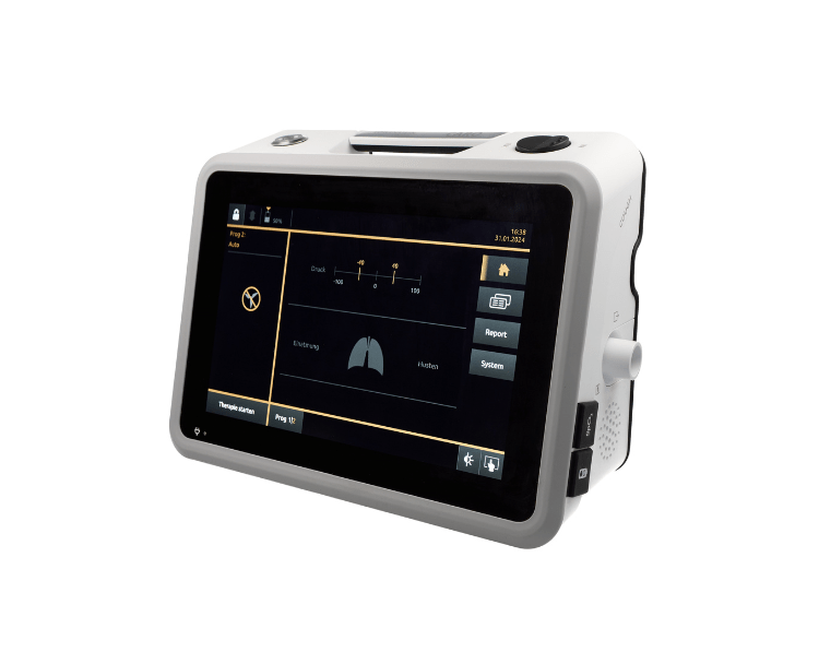 Ein klar strukturierter Menüaufbau und ein 10"-Touchscreen sorgen für eine einfache, sichere Bedienung – ideal für Pflegekräfte, Therapeutinnen und Anwender im Alltag. Nutzerinnen und Nutzer des Beatmungsgeräts LUISA profitieren von der vertrauten Benutzeroberfläche. -