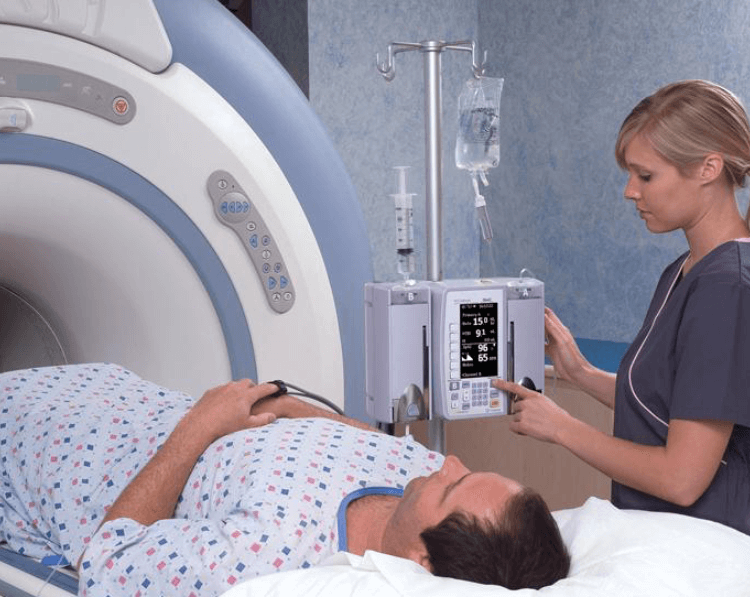 Die Pumpe eignet sich sowohl als Einzel- als auch als Doppelpumpe – für den Einsatz mit Infusionsflaschen und Perfusorspritzen. Ihre benutzerfreundliche Steuerung ermöglicht es dem medizinischen Personal, alle Einstellungen bequem und sicher vom MRT-Kontrollraum aus vorzunehmen – ohne Unterbrechung der Untersuchung.