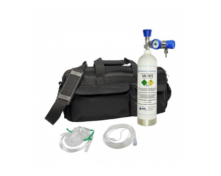 Der gasförmige Sauerstoff wird über einen Druckminderer mit Flowmeter oder ein separates Steuergerät dosiert. Viele Systeme arbeiten besonders sparsam, da sie den Sauerstoff nur während der Einatmung abgeben. Voraussetzung ist, dass der Patient den Fluss eigenständig regulieren kann. Für unterwegs steht ein praktischer Trolley mit Tasche zur Verfügung.